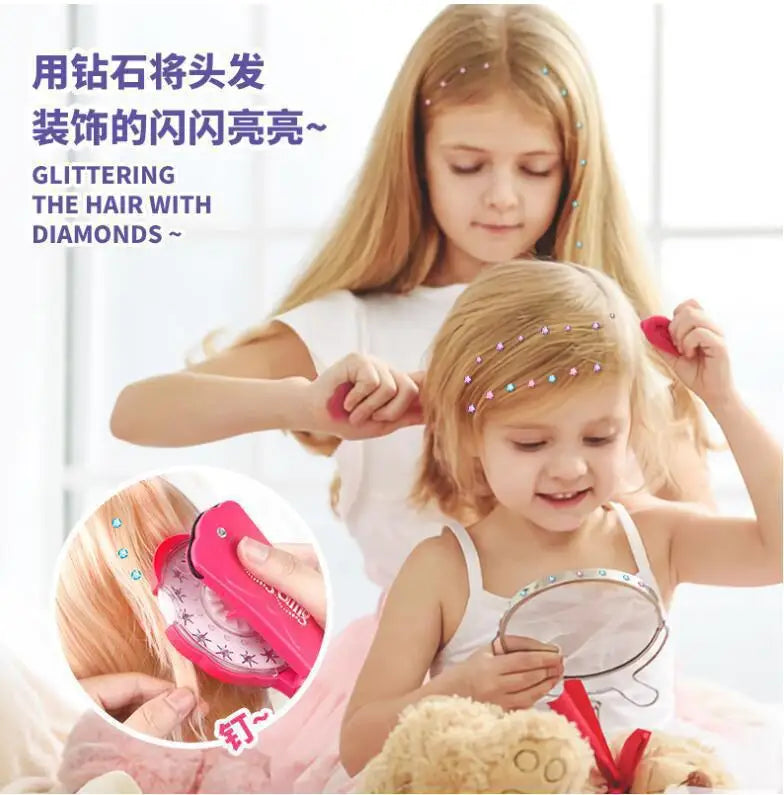 The stamper contains safe materials which work with a gentle adhesive system to create diamond accessory looks for hair and wedding-inspired diamond wedding hair accessories and premium luxury diamond studded hair accessories that children can use safely and washable and non-toxic. The product serves two purposes by providing everyday sparkle and dress-up options for birthdays and school events and pretend play activities.